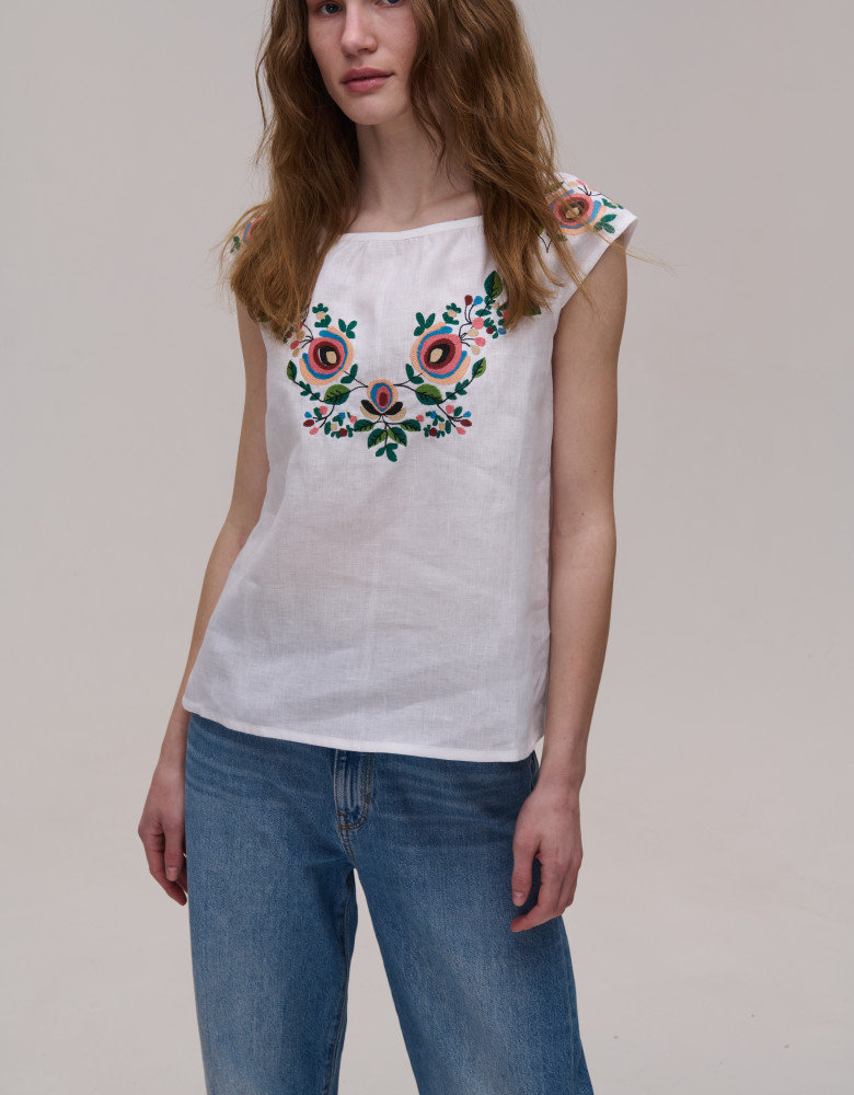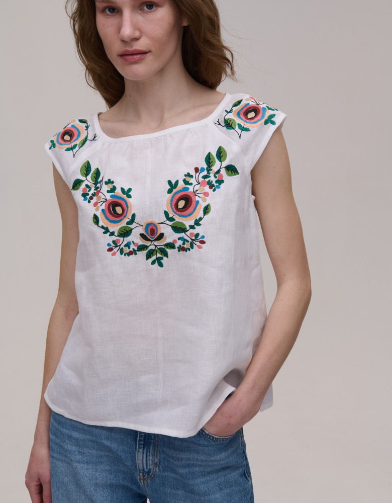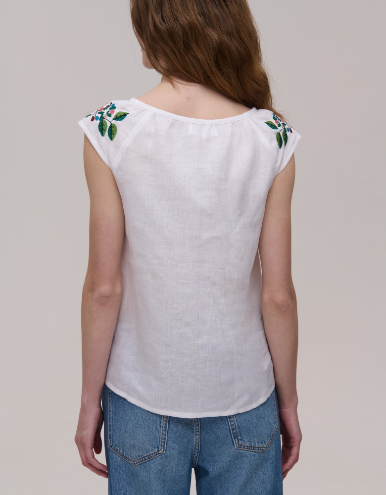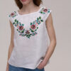 Блуза прямого крою, має округлу горловину та короткий рукав. На бокових швах сорочки є невеликі розпірки, які дозволяють по-різному заправляти низ і створювати нові образи. Оздоблена вишивкою на грудях та плечах.