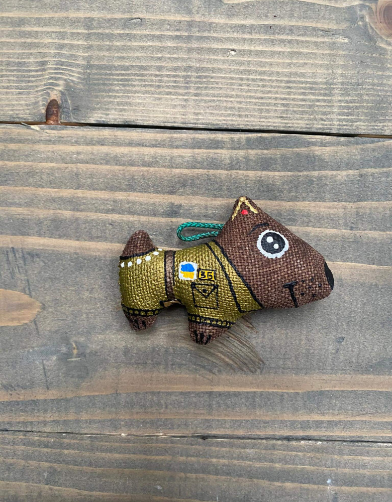 Песик пошитий з натуральної тканини, покрита спеціальним еко-розчином ваніліну та какао, який зберігає приємний аромат іграшки приблизно пів року.