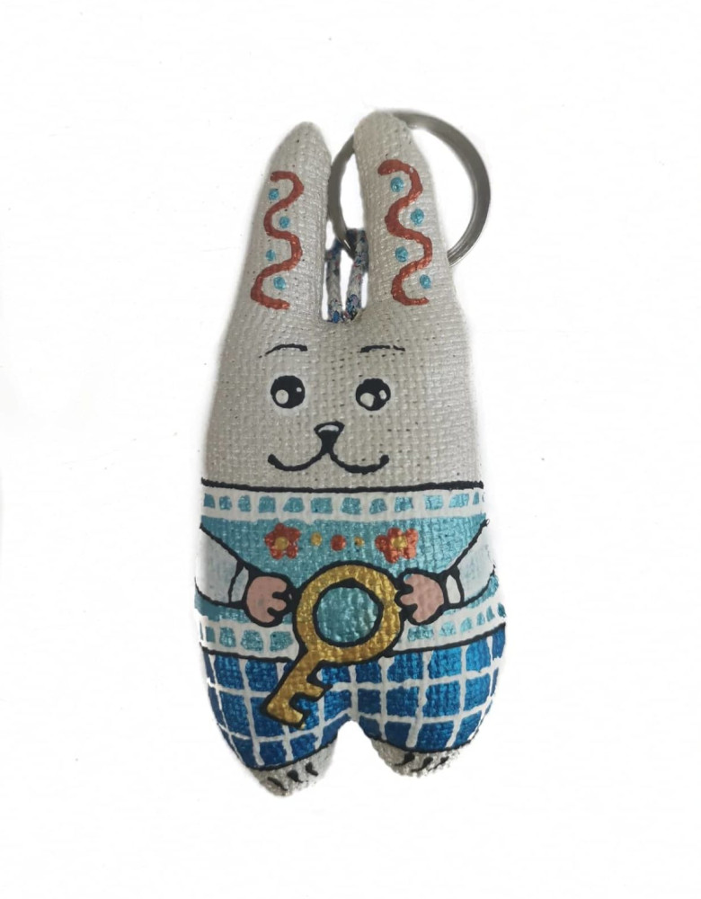 Іграшка в етно стилі створена тернопільськими майстрами. Іграшка пошита з натуральних тканин, покрита розчином ваніліну, аромат іграшки зберігається приблизно півроку. Етно розписи виконані вручну.На Поліссі є легенда, чому в зайця таке маленьке серце: Бог виліпив йому дуже довгі вуха, а на серце не вистачило глини, тоді Бог відірвав йому хвіст (залишивши лише куций відросток) і виліпив з нього сердечко. «Українська міфологія» Войтович В., К:Либідь, 2012В цьому сувенірі ми поєднали давні традиції і сучасний дизайн. Такий подарунок стане до вподоби дітям та дорослим, що цінують мистецтво та традиції.Підвіска для сумки, рюкзака.