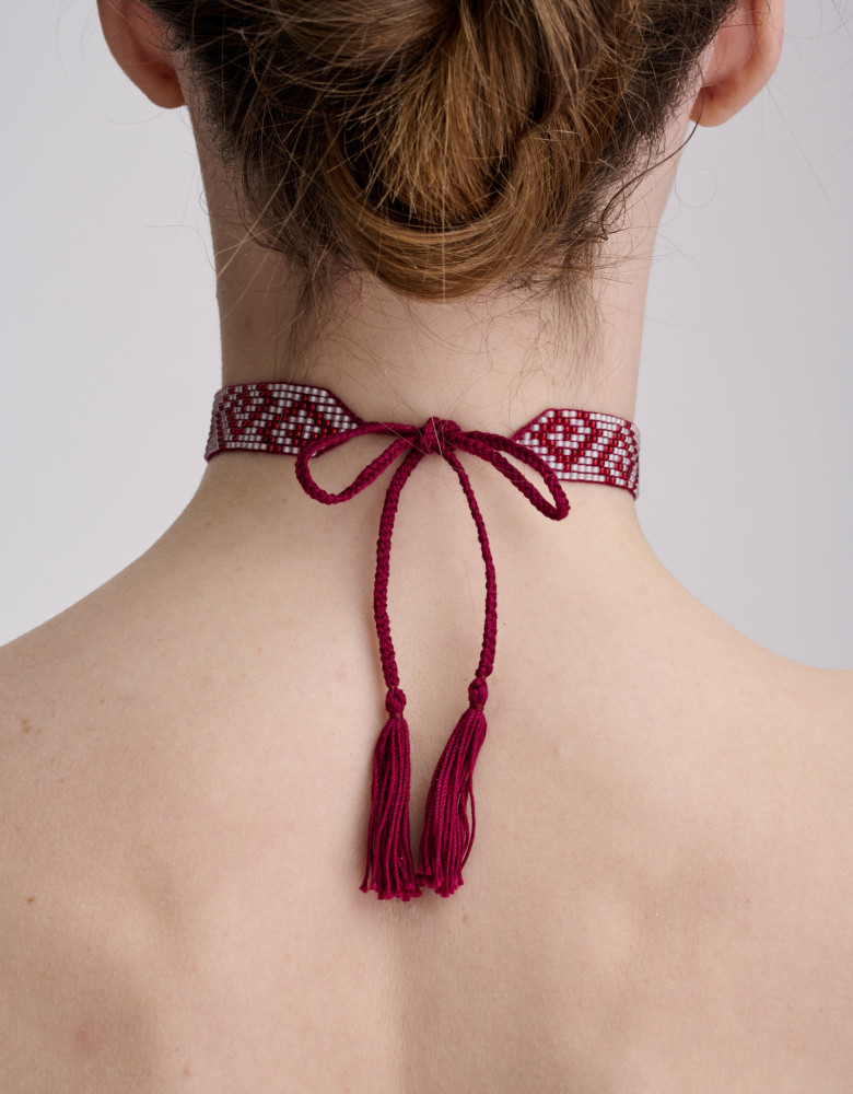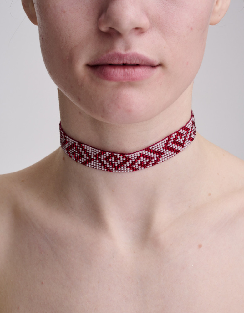 Намисто-чокер “Безкінечник” — витончена прикраса, створена вручну з бісеру благородного бордового кольору. У ній сучасна лаконічність зустрічається з народними мотивами, утворюючи гармонійне доповнення до вишиванки, лляної сукні чи щоденного образу з натяком на традицію.