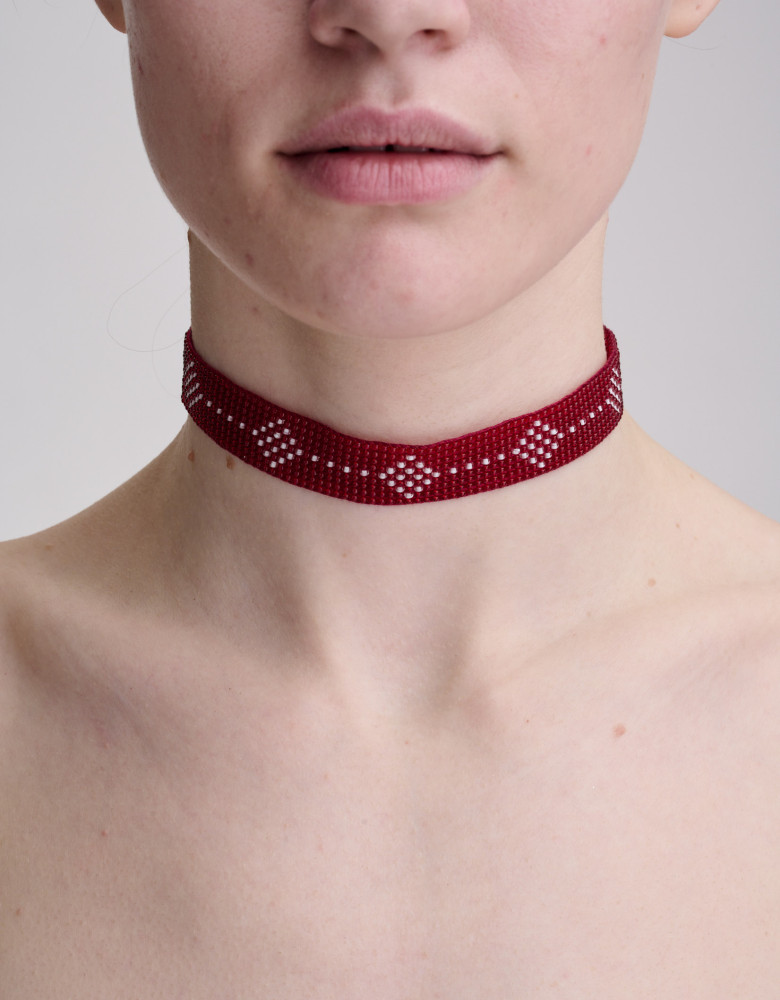 Намисто-чокер “Бордо” — витончена прикраса, створена вручну з бісеру благородного бордового кольору. У ній сучасна лаконічність зустрічається з народними мотивами, утворюючи гармонійне доповнення до вишиванки, лляної сукні чи щоденного образу з натяком на традицію.