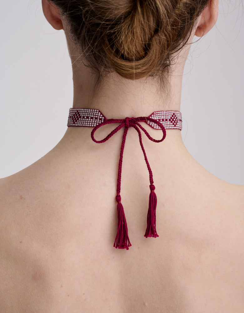 Намисто-чокер “Святковий” — витончена прикраса, створена вручну з бісеру благородного бордового кольору. У ній сучасна лаконічність зустрічається з народними мотивами, утворюючи гармонійне доповнення до вишиванки, лляної сукні чи щоденного образу з натяком на традицію.