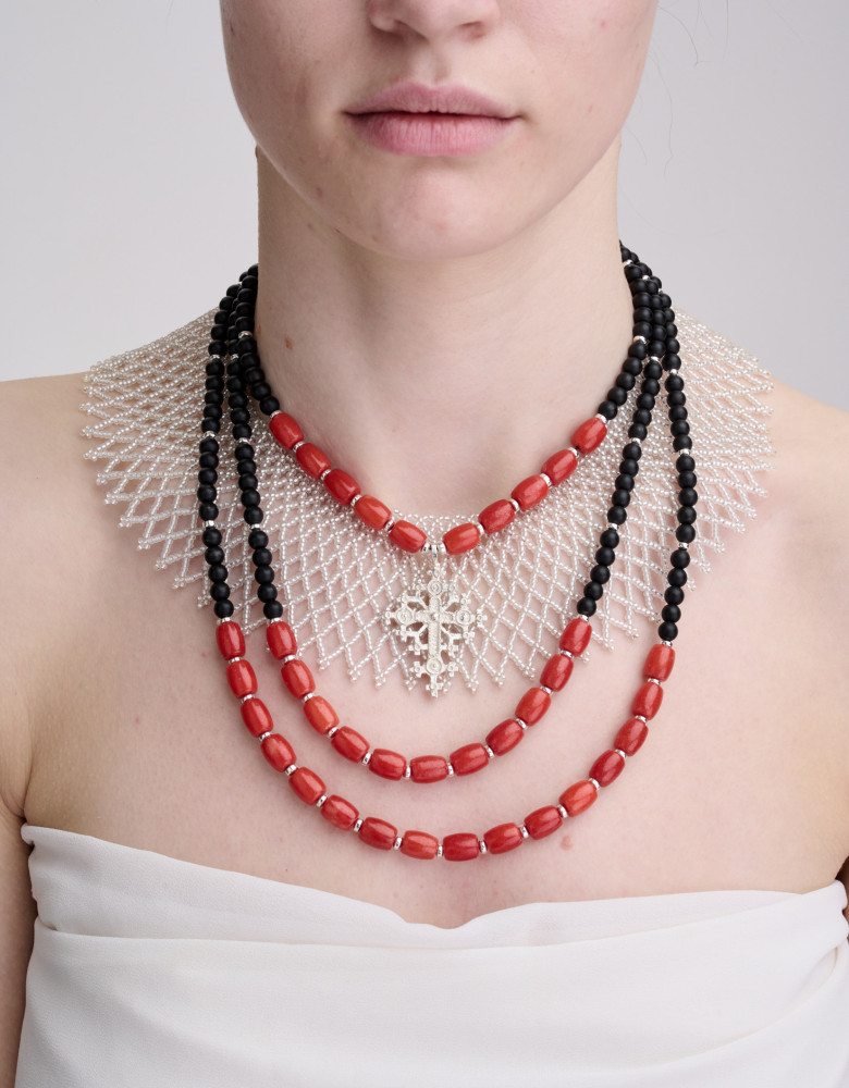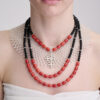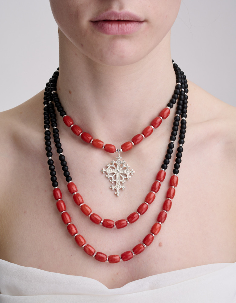 Намисто з теракотового коралу і шунгіту на три низки зі срібним хрестиком