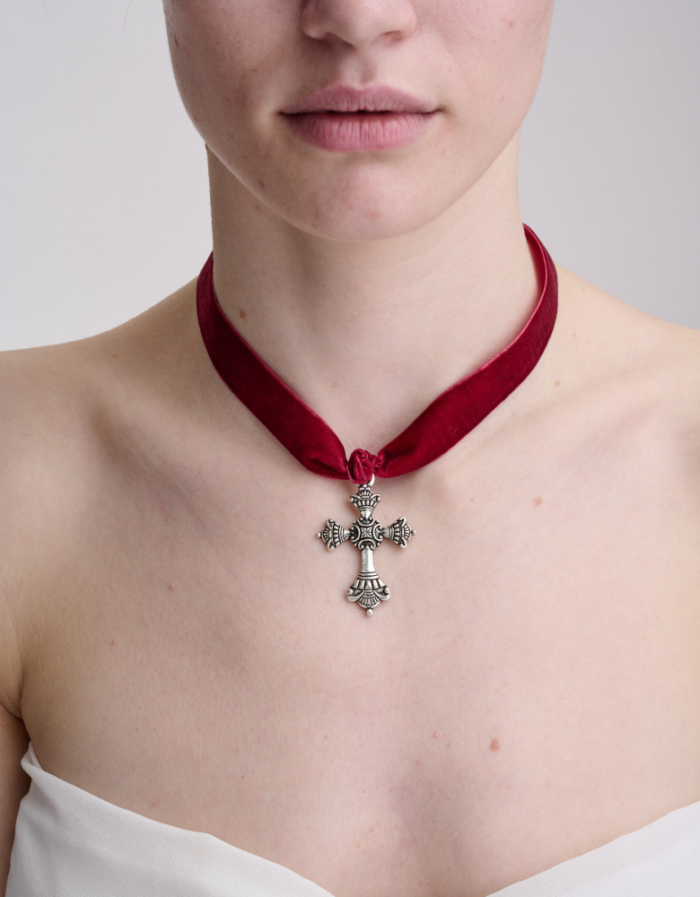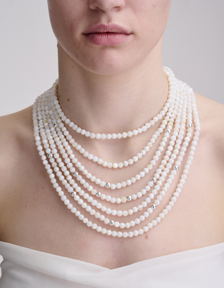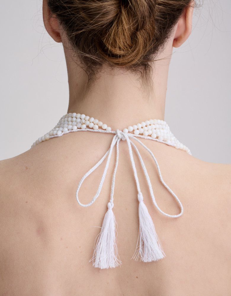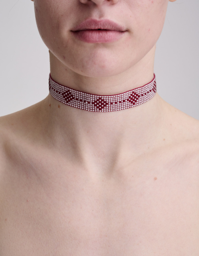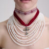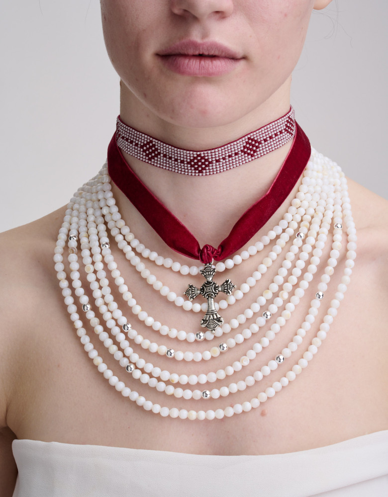 Білий перламутр, із своєю неповторною атмосферою, надає намисту витонченості та природного блиску. Бордовий чокер з бісеру вносить елемент чуттєвості та додає образу вишуканості, а чокер з хрестом виражає вашу індивідуальність та стиль.