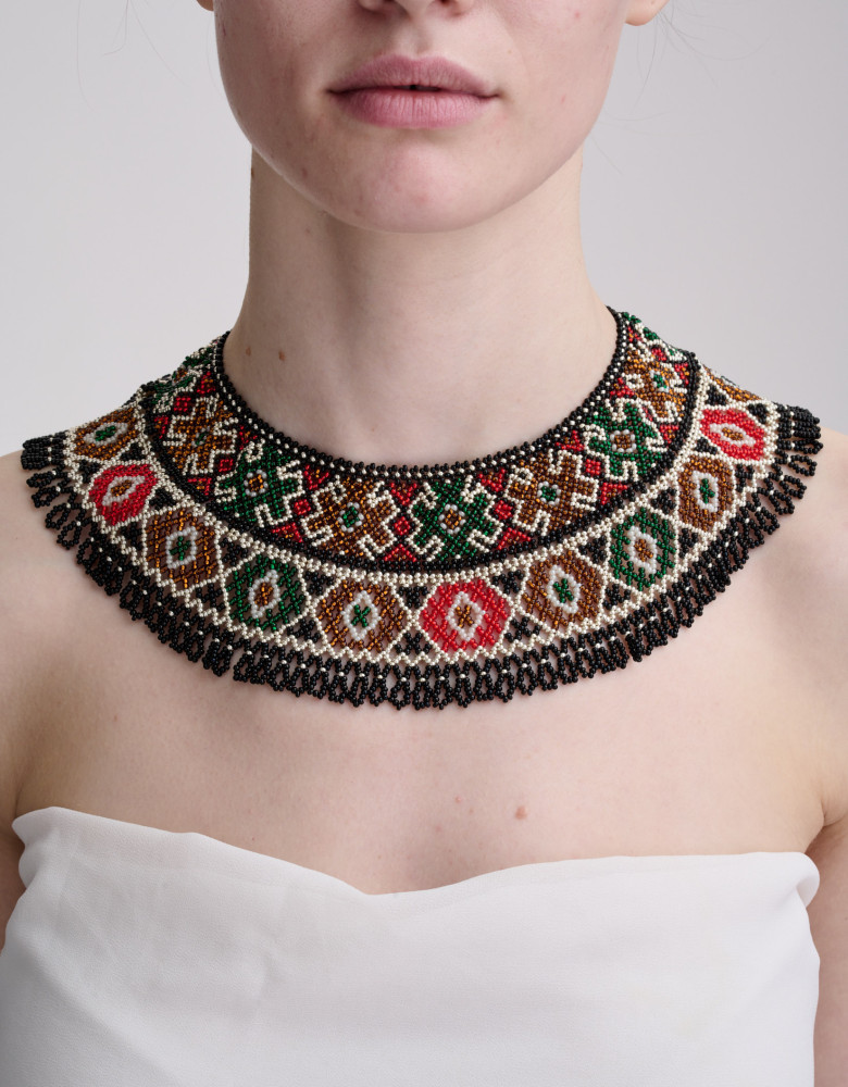 Це намисто – це справжня витонченість у вишуканому дизайні та орнаменті. Яскраві візерунки, що переплітаються у відтінках бежевого, зеленого та червоного бісеру, вбирають в себе всю красу навколишнього світу.