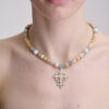 Намисто виражає вишукану елегантність, адже об’єднує в собі перламутр золотистого відтінку, блакитний агат, вставки з білого перламутру та гематиту.