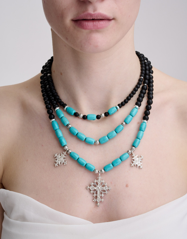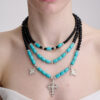 Даруйте собі частинку таємничого красномовства та елегантності з нашим унікальним намистом ручної роботи – створене з чорного шунгіту, срібних хрестів та бірюзового гематиту, вражає не тільки своєю красою, але й енергетикою натхнення.