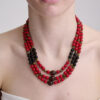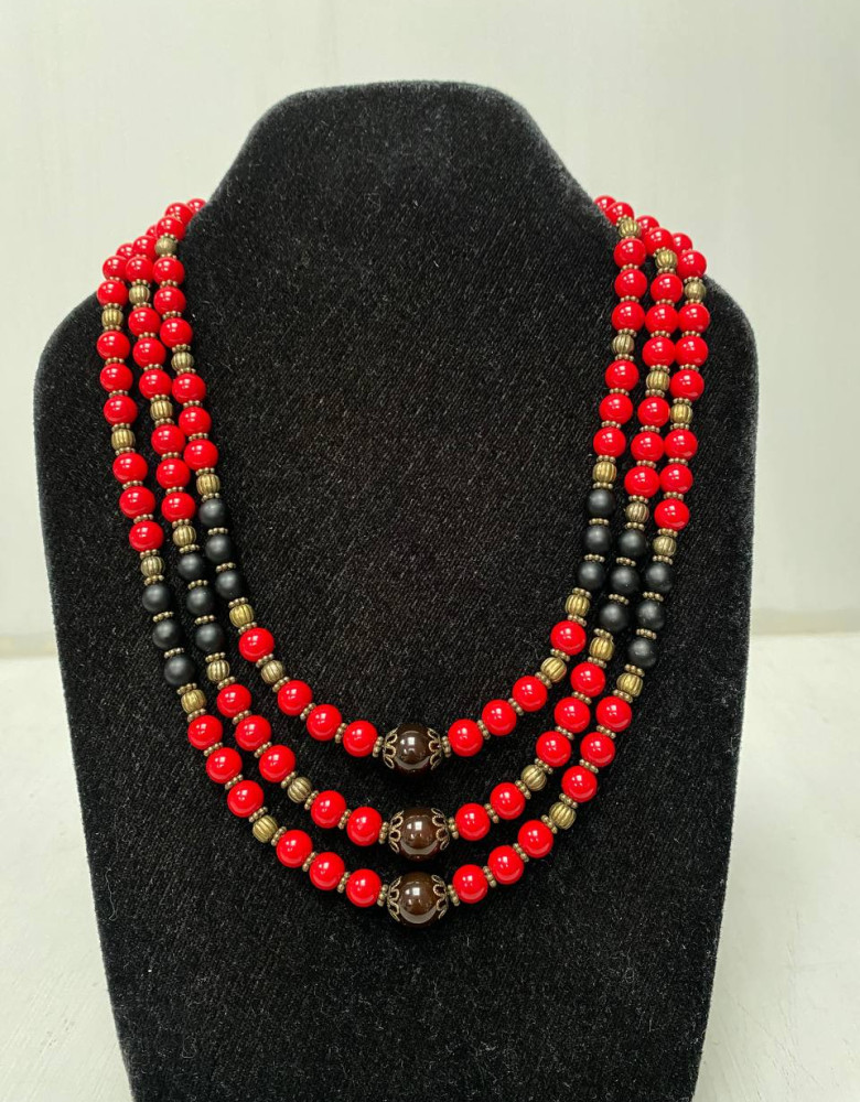 Намисто нанизане скляними намистинами в три ряди. Скляні прикраси здавна були привілеєм серед найзаможніших панянок. Червоно-чорний колір чудово контрастує та колоритно поєднується у намисті. Неймовірно красиво пасує до образів у поєднанні з багатошаровими прикрасами.