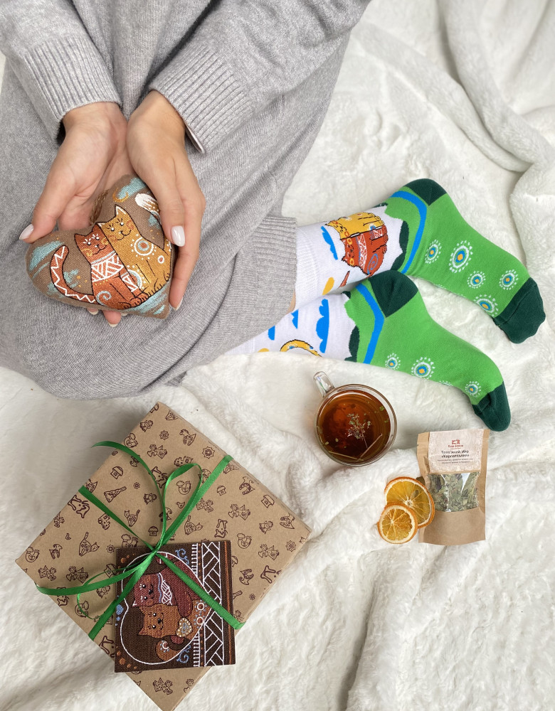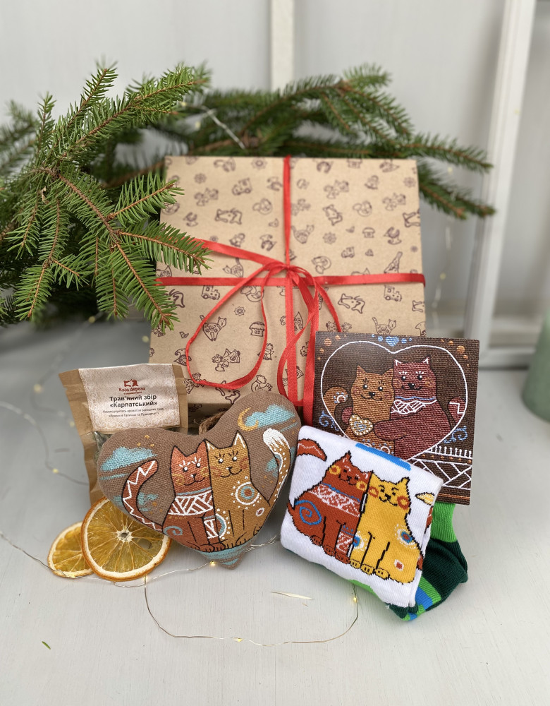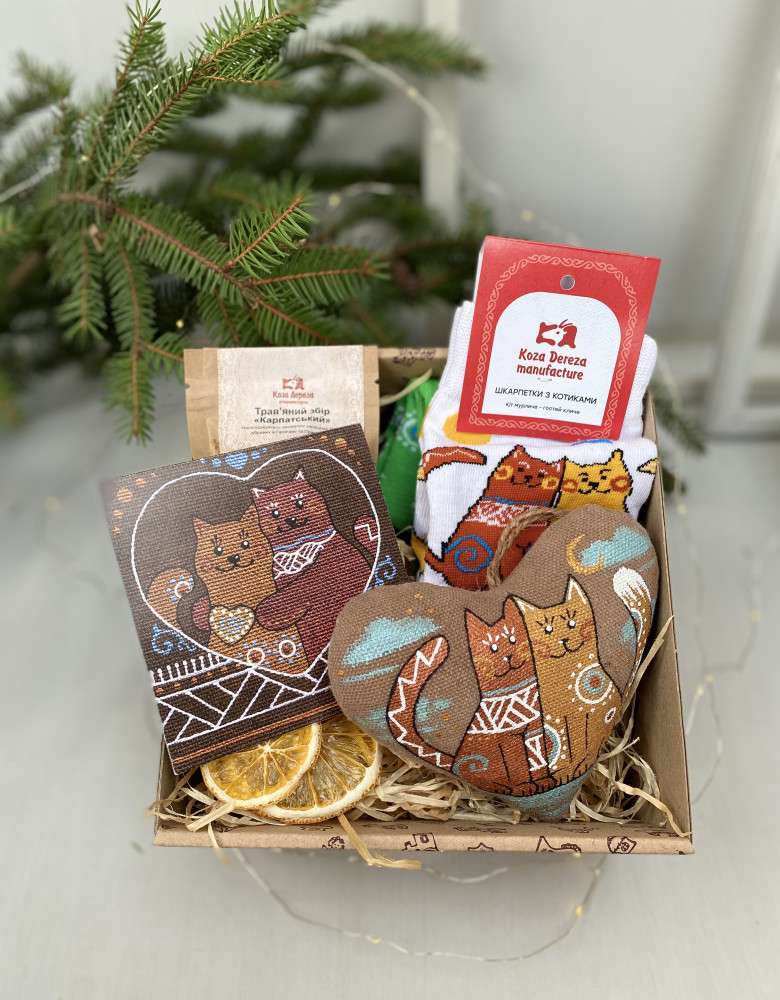 Поглибіться в атмосферу тепла та затишку з нашим сувенірним набором, створеним для того, щоб порадувати. Цей унікальний набір включає сувенір “Серце з котами”, шкарпетки, листівку, слайси апельсинів та чай, створюючи ідеальну атмосферу для часу насолоди та відпочинку.