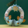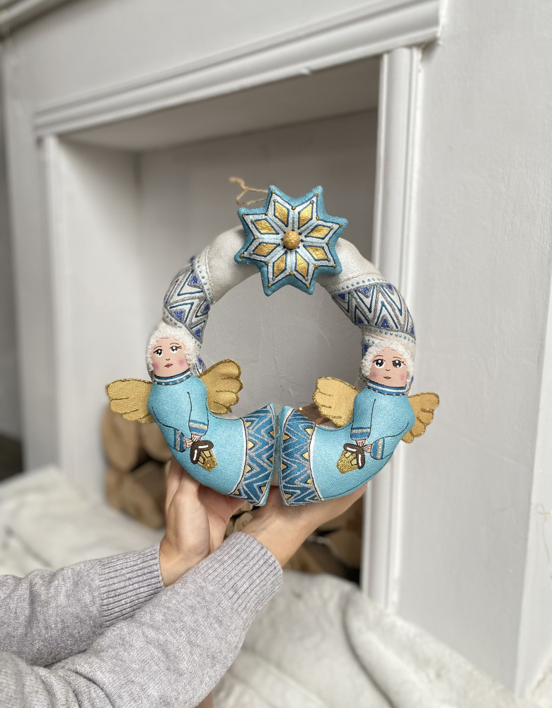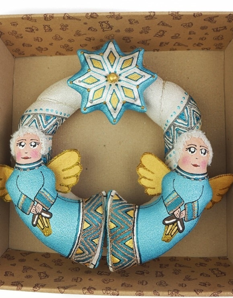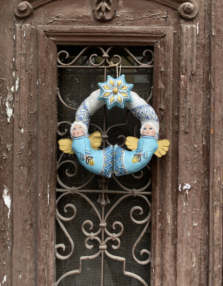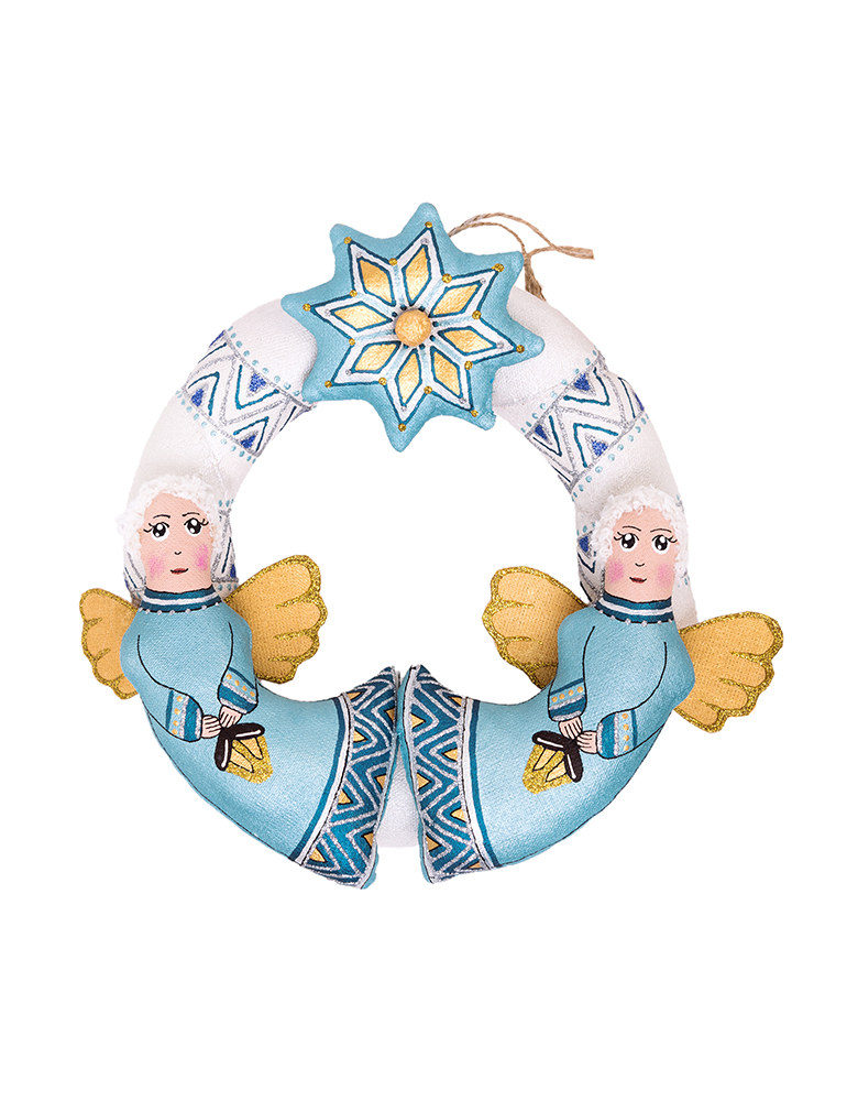 На різдвяному віночку красується Вифлеємська зірка, яка вказує шлях до початку чогось нового. Новорічно-різдвяний декор пошитий з натуральних тканин, наповнений синтепоном. Основа покрита розчином ванілі, що має приємний аромат. Розписаний вручну нашими майстрами з використанням якісних акрилових фарб. Іграшка стійка до стирання та впливу зовнішнього середовища.