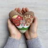 Іграшка в етно стилі створена тернопільськими майстрами.Серце пошите з натуральних тканин, покрите розчином кави, кориці, ваніліну, аромат іграшки зберігається приблизно півроку. Етно розписи виконані вручну.