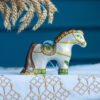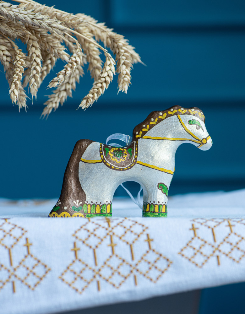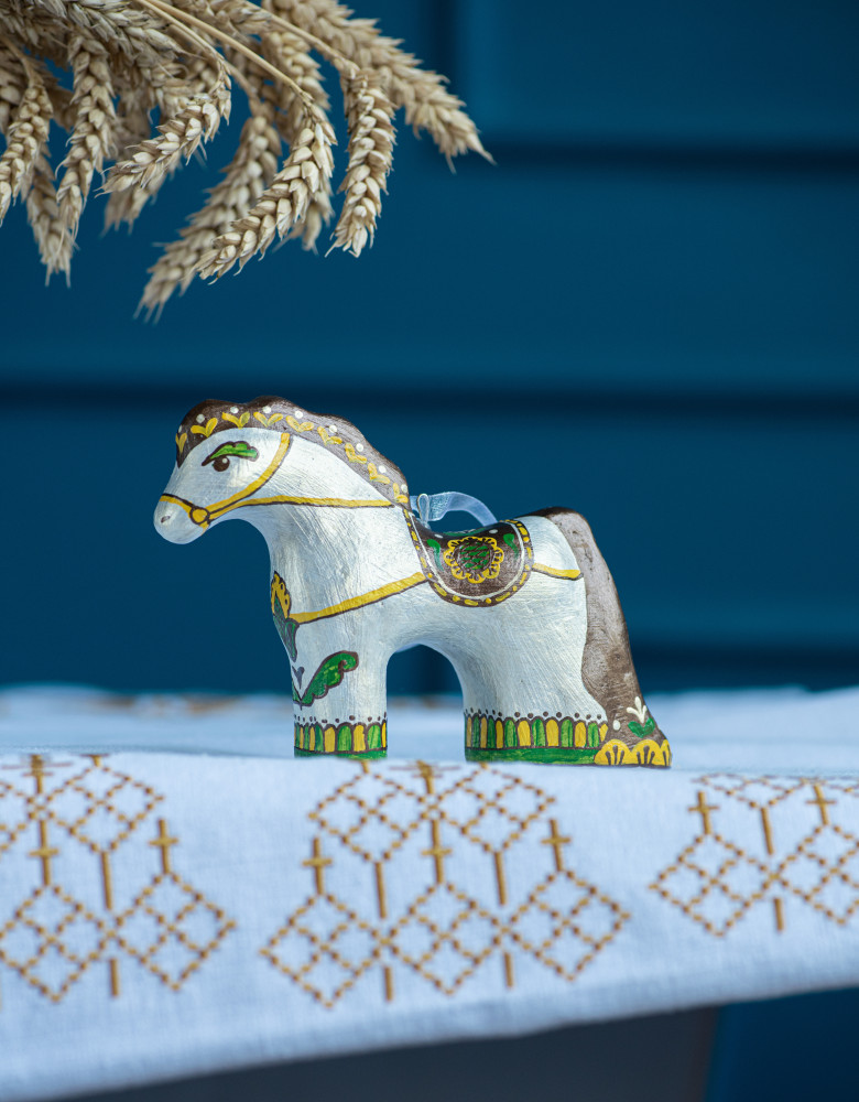 Наша любов та повага до традицій косівської кераміки, втілена в символ прийдешнього року. Коник розфарбований саме в стилі цього ремесла, і несе в собі древні символи наших предків. Іграшка виготовлена в авторській техніці з використанням суміші паперу, тирси, води, гречаного лушпиння та клейстеру.