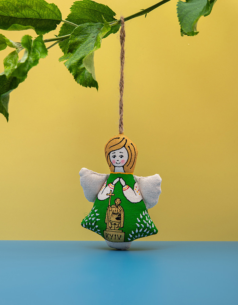 Іграшка в етно стилі створена тернопільськими майстрами. Янголи пошиті з натуральних тканин, покриті розчином ваніліну, аромат іграшки зберігається приблизно півроку.