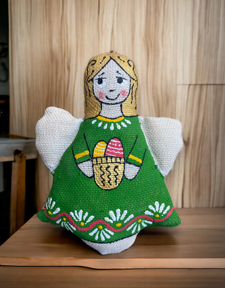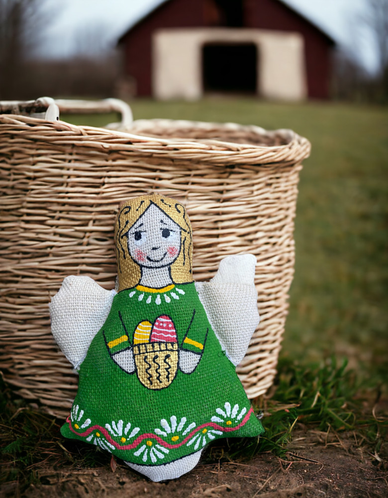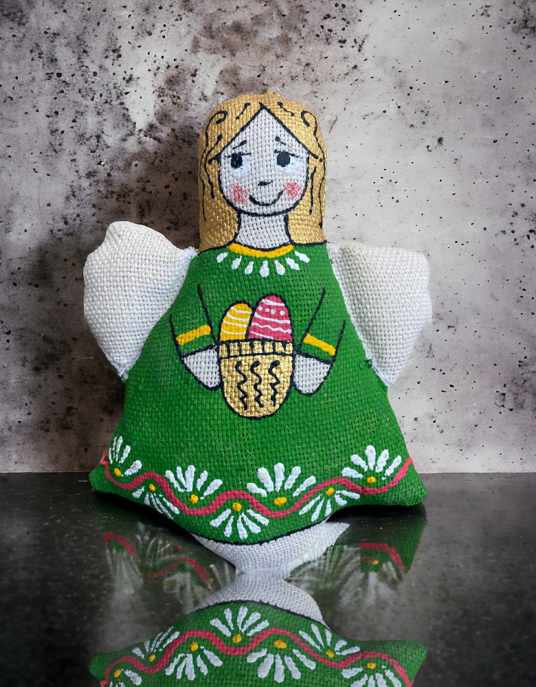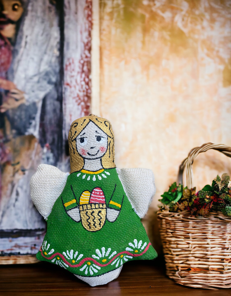 Янгол весь у великодніх клопотах. Помалював писанки й крашанки, гарно вбрався та чекає свята. Янгол – передвісник надії, добра та захисту.