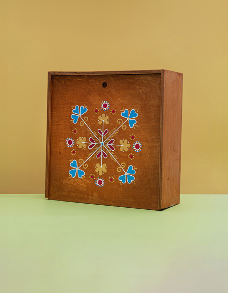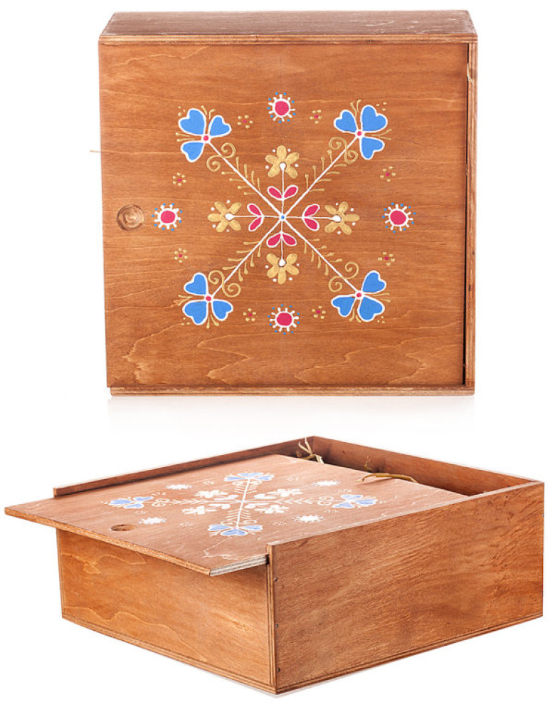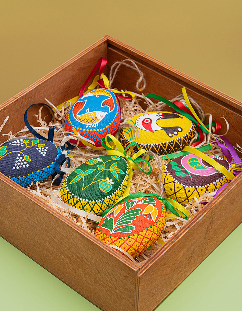 В наборі: дерев’яна коробка, яйця, сіно. Іграшка в етно стилі, створена тернопільськими майстрами.