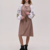Сукня прямого силуету з центральним розрізом на горловині. Має пояс з китицями, що робить силеут сукні ще більш виточеним. На довгих рукавах з призбіркою розміщена вишивка.