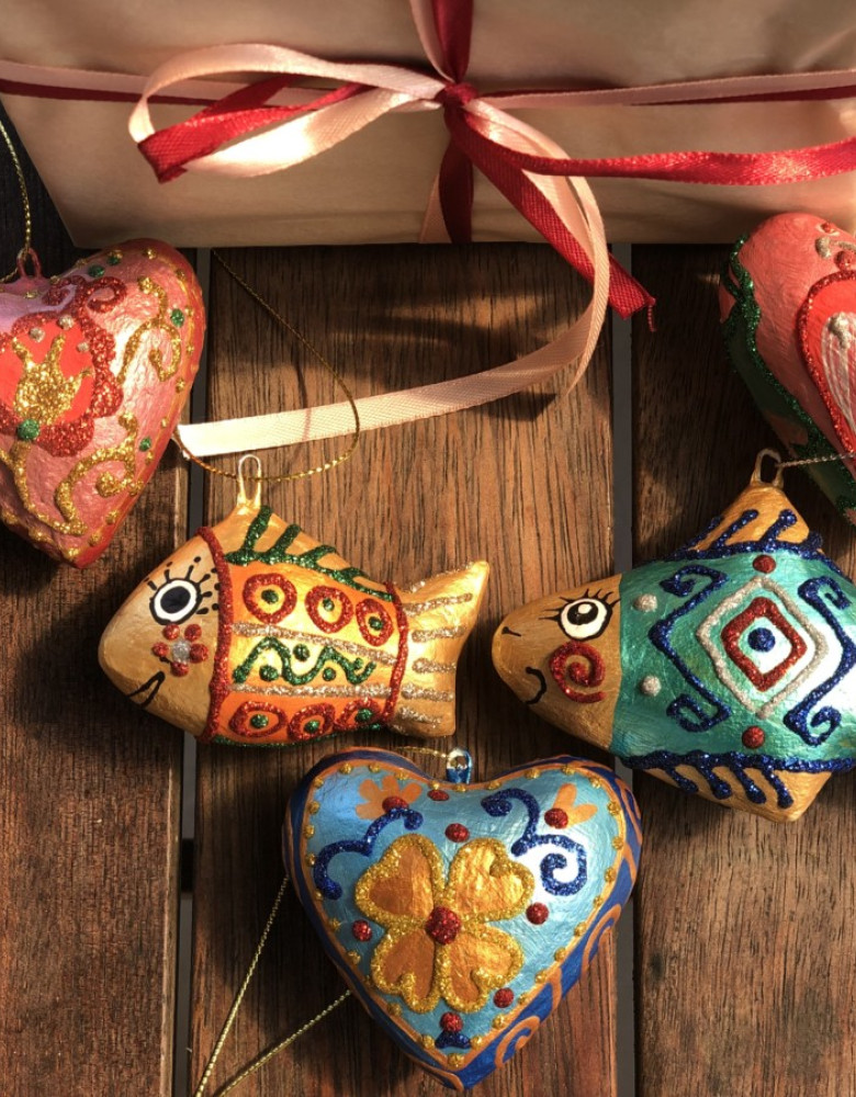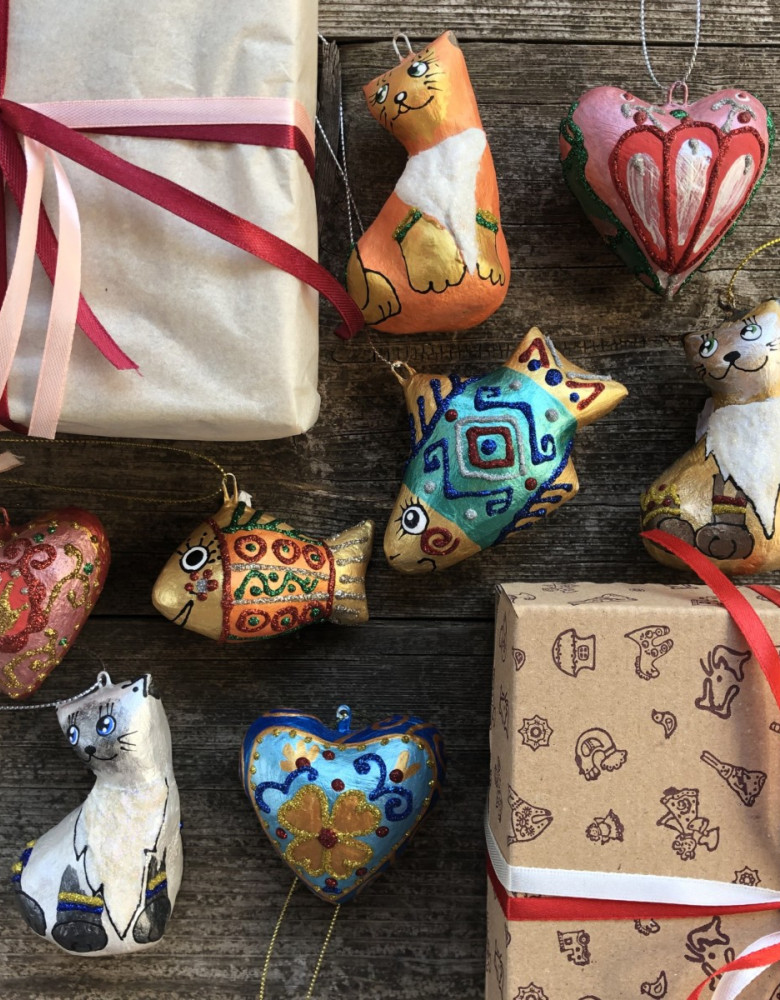 Скульптурні іграшки створені під враженнями від ялинкових прикрас у стилі ретро, які колекціонували галицькі міщани та передавали в сім’ях з покоління в покоління. Виконані в авторській техніці з використанням тирси та паперу.
