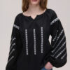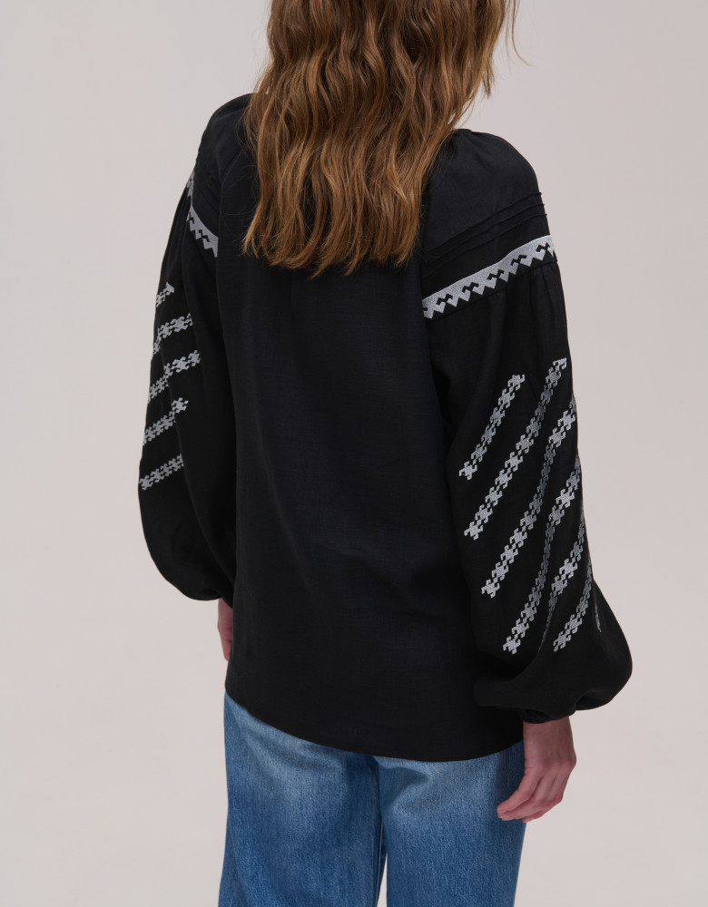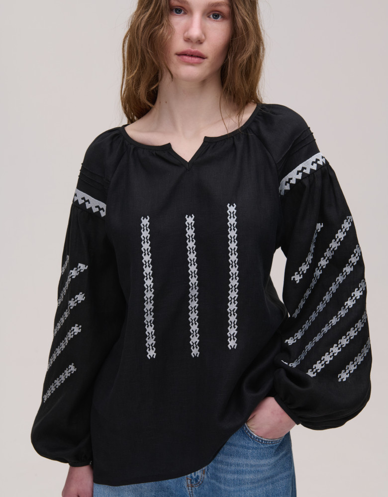 Сорочка прямого крою. Має округлу горловину з центральним вирізом та призбірку на рукавах.