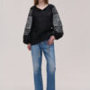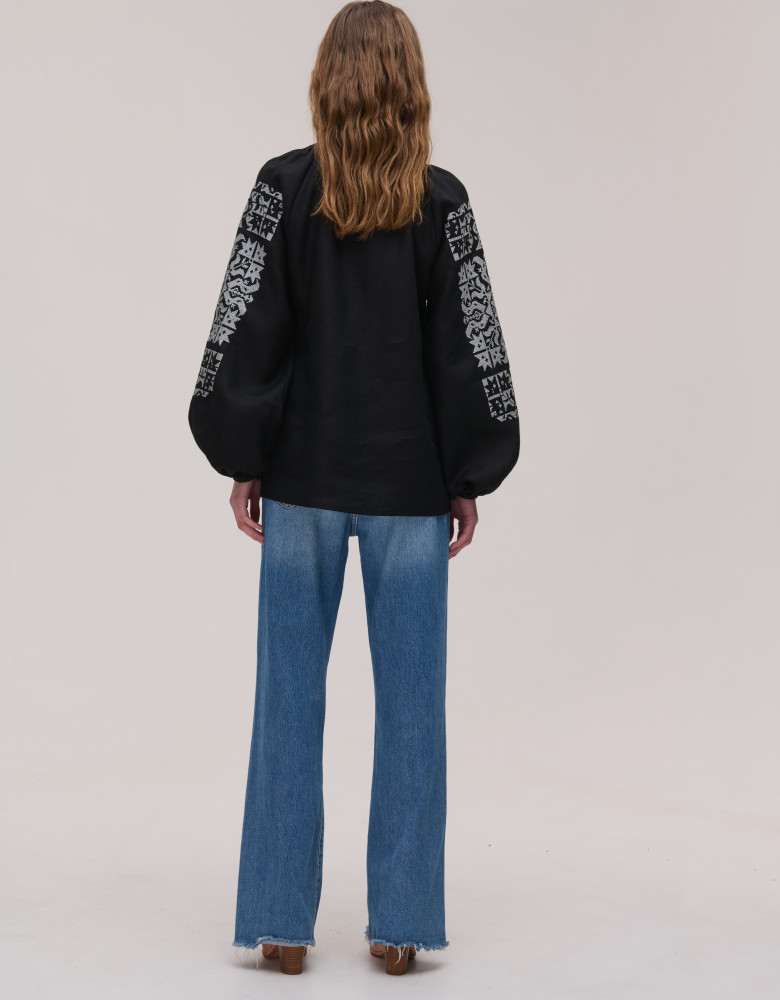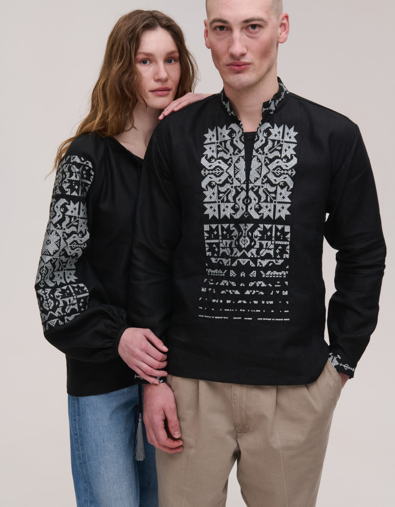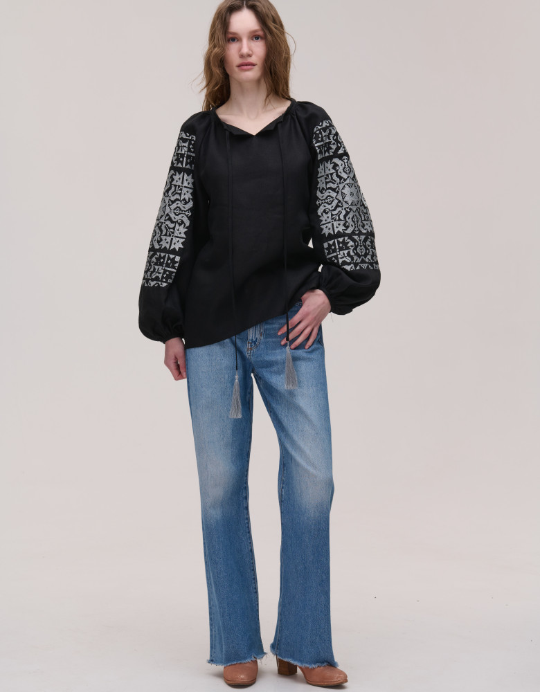Сорочка прямого крою. Має центральний розріз, який можна зв’язати шнурівками-китицями на горловині, з призбіркою на рукавах.