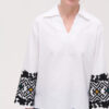Жіноча сорочка на широкий рукав, оздоблений ручною вишивкою. Має округлу горловину з центральним розрізом.